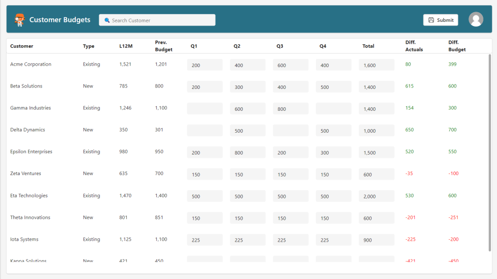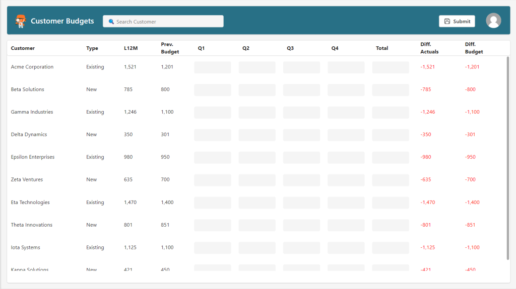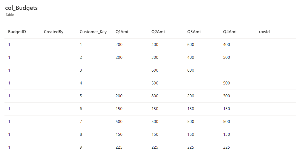 The Customer_Key is the Unique Identifier for the customer, in this case dealt with as an integer. The Q1-Q4Amt is the amounts for Q1 to Q4, I prefer this over the total, as it gives me a lower granularity. One could also split this into months, or sum it for a year if that’s more interesting. The BudgetID is generally useless in this scenario, however if we look a bit further down the line, we might wanna introduce multiple budget versions, that could simply be Budget2024 and Budget2025, and a BudgetID will make that easier to deal with. The CreatedBy column is just to enter whoever triggered the creation of the record in question. It serves no real purpose in this scenario, other than traceability.